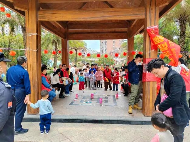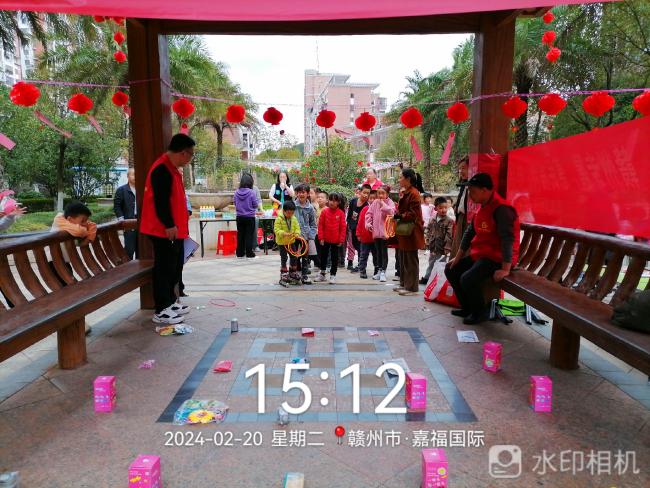 贛州嘉福國際小區聯合泥灣里社區開展“歡歡喜喜鬧元宵  鄰里和睦暖心田”猜燈謎游園活動,一排排懸掛的彩色燈謎條渲染出喜慶的節日氛圍,妙趣橫生的燈謎吸引眾多業主前來參與,有趣的小游戲吸引孩子們駐足游玩。只見業主們帶著孩子,穿梭在懸掛的燈籠中,看謎面、猜謎語、玩游戲,現場一片歡聲笑語,共同度過其樂融融的歡樂時光。