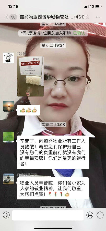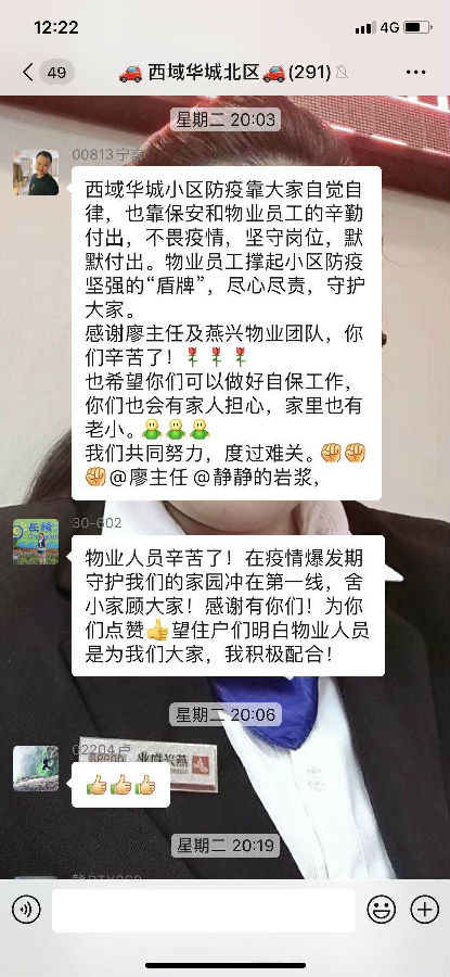 “剛開(kāi)始的那些天,廖主任每天堅(jiān)持勸阻住戶(hù)少出門(mén),聲音都沙啞。還時(shí)常有不理解的住戶(hù)還罵人、甚至沖崗,但她始終保持好心態(tài)對(duì)住戶(hù)耐心勸阻。”陽(yáng)光西域華城小區(qū)羅鳴說(shuō)。有一名住戶(hù)因扁桃體發(fā)炎引發(fā)高燒,廖玲一直通過(guò)微信等方式開(kāi)導(dǎo)住戶(hù),并監(jiān)測(cè)住戶(hù)的體溫,讓其杜絕恐慌安心康復(fù),及時(shí)傳遞“平衡性信息”的做法得到當(dāng)事人及廣大租戶(hù)的贊賞。