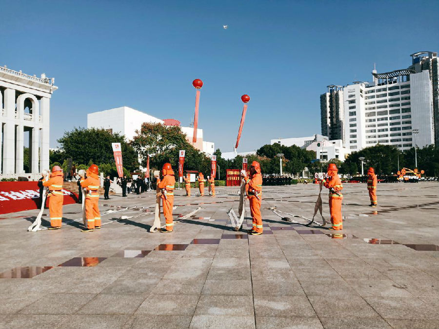 15時20分,黃金廣場艷陽高照,人聲鼎沸,大檢閱活動在莊嚴的《中華人民共和國國歌》聲中拉開帷幕。公司黨委副書記、總經理劉南斗首先發表熱情洋溢致辭。劉總指出:開展崗位練兵成果展示,是我們深入貫徹黨的十九大精神,落實“質量強國”發展戰略,堅持“質量第一”價值導向的重要行動,也是展現物業管理從業人員專業形象和精神風貌,踐行2018年物業管理行業服務質量提升年工作主題,更是增強優質物業服務供給能力、更好地滿足廣大業主對優質物業服務的需求,讓更多的人知道物業,讓更多人了解物業,讓更多的人支持物業的具體舉措。劉總表示,通過這次崗位練兵技能展示,我們要以練兵促提升,以展示促發展,創新行業人才培養、選拔、激勵機制,提高行業從業人員的專業能力和綜合素質,為物業行業轉型升級和高質量發展提供技術支撐和人才保障,讓物業成為有奔頭的產業,讓物業成為有吸引力的職業,讓物業成為讓人尊重的行業。