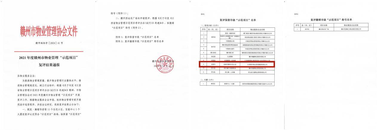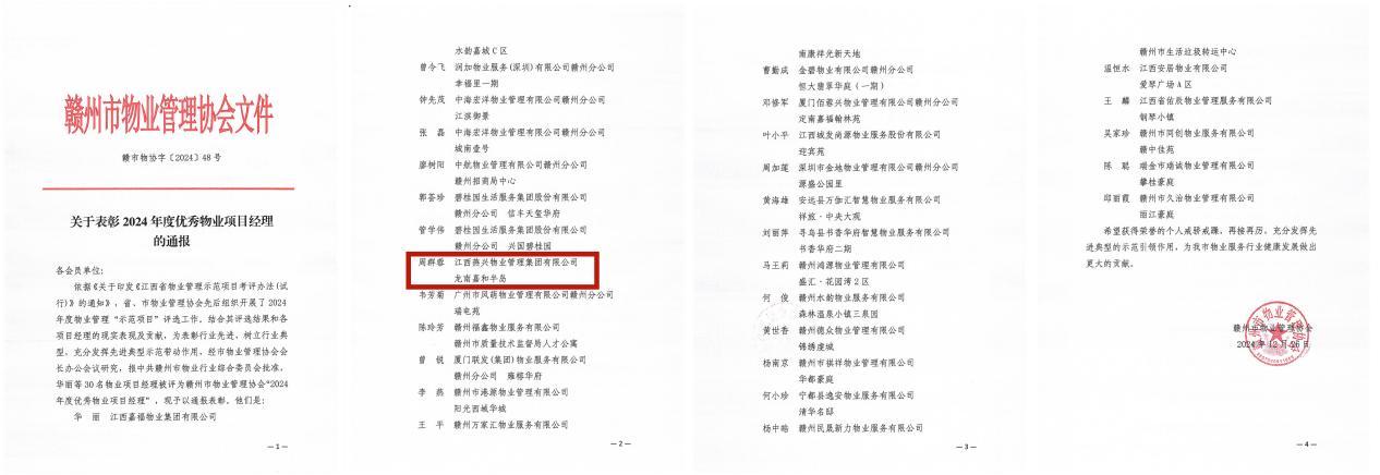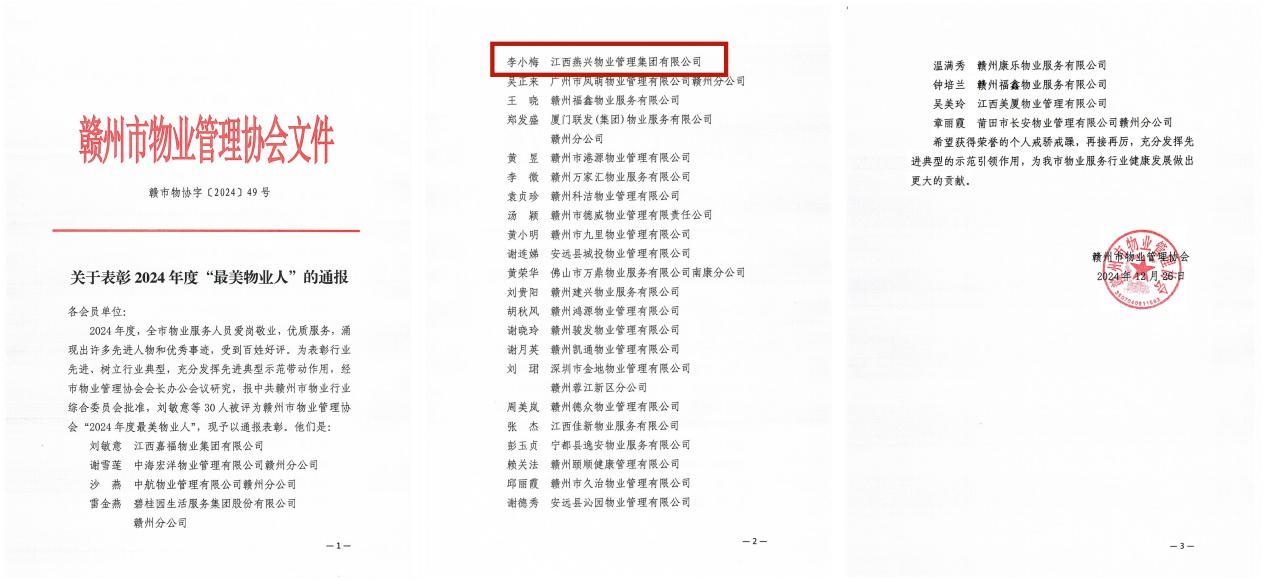 2025年元月7日,贛州市物業(yè)管理協(xié)會第五屆三次會員大會在贛州市格蘭云天國際酒店勝利召開,會上對2024年度優(yōu)秀物業(yè)企業(yè)及個人進行了通報表彰。燕興物業(yè)喜獲贛州市“2024年度優(yōu)秀物業(yè)企業(yè)”“2024年度誠信自律企業(yè)”“2024年度支持文明城市創(chuàng)建先進企業(yè)”榮譽稱號;龍南嘉和半島小區(qū)復評通過“贛州市優(yōu)秀示范小區(qū)”,項目經(jīng)理周群蓉喜獲“2024年度優(yōu)秀物業(yè)項目經(jīng)理”榮譽稱號,公園壹號小區(qū)物管員李小梅獲得“最美物業(yè)人”榮譽稱號。