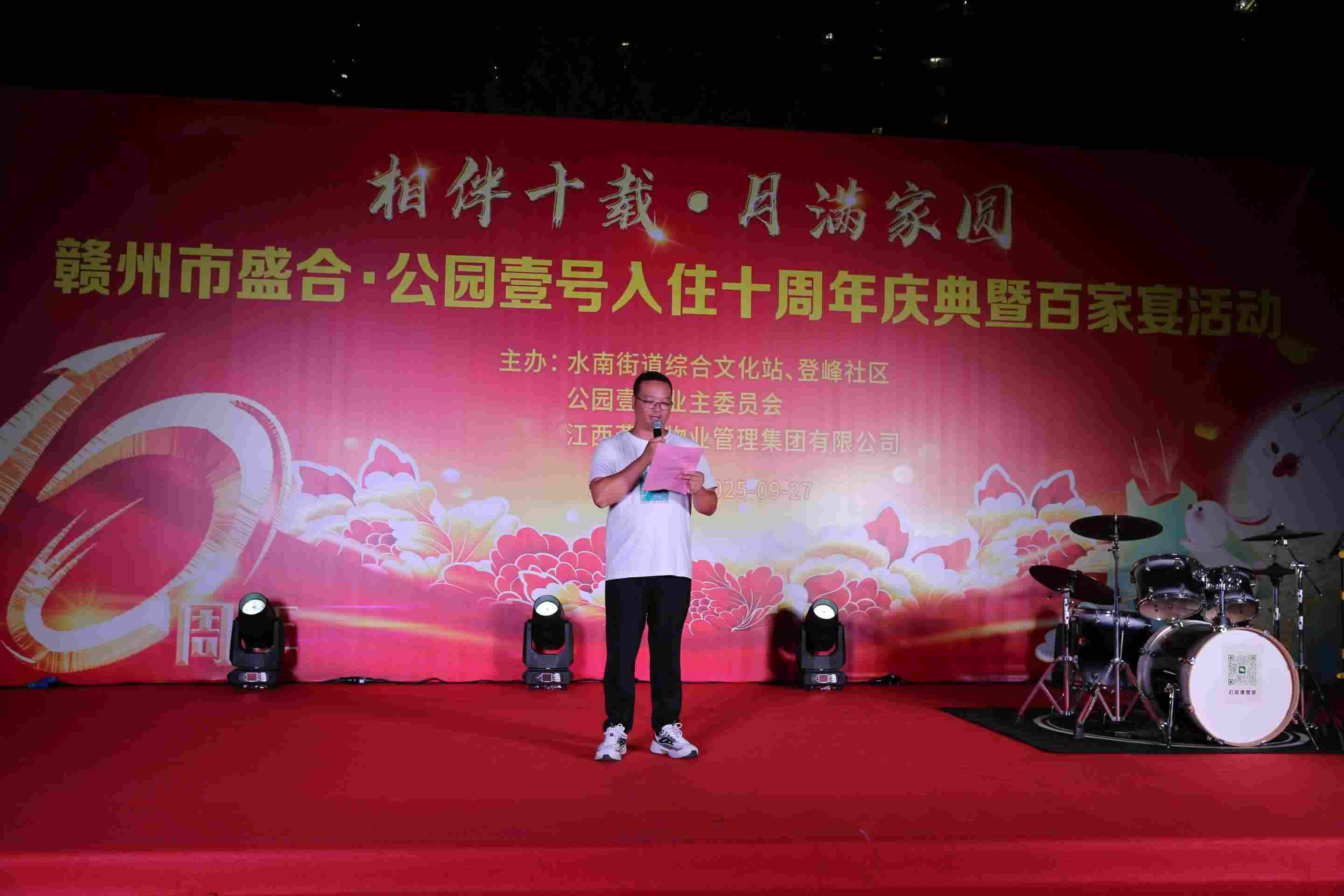 金秋送爽,丹桂飄香。9月27日晚,章貢區水南街道登峰社區盛合·公園壹號小區張燈結彩、歡聲笑語,一場以“相伴十載·月滿家圓”為主題的業主入住十周年慶典暨百家宴活動溫馨上演,燕興物業集團代表和數百名業主代表歡聚一堂,共敘十年鄰里深情。