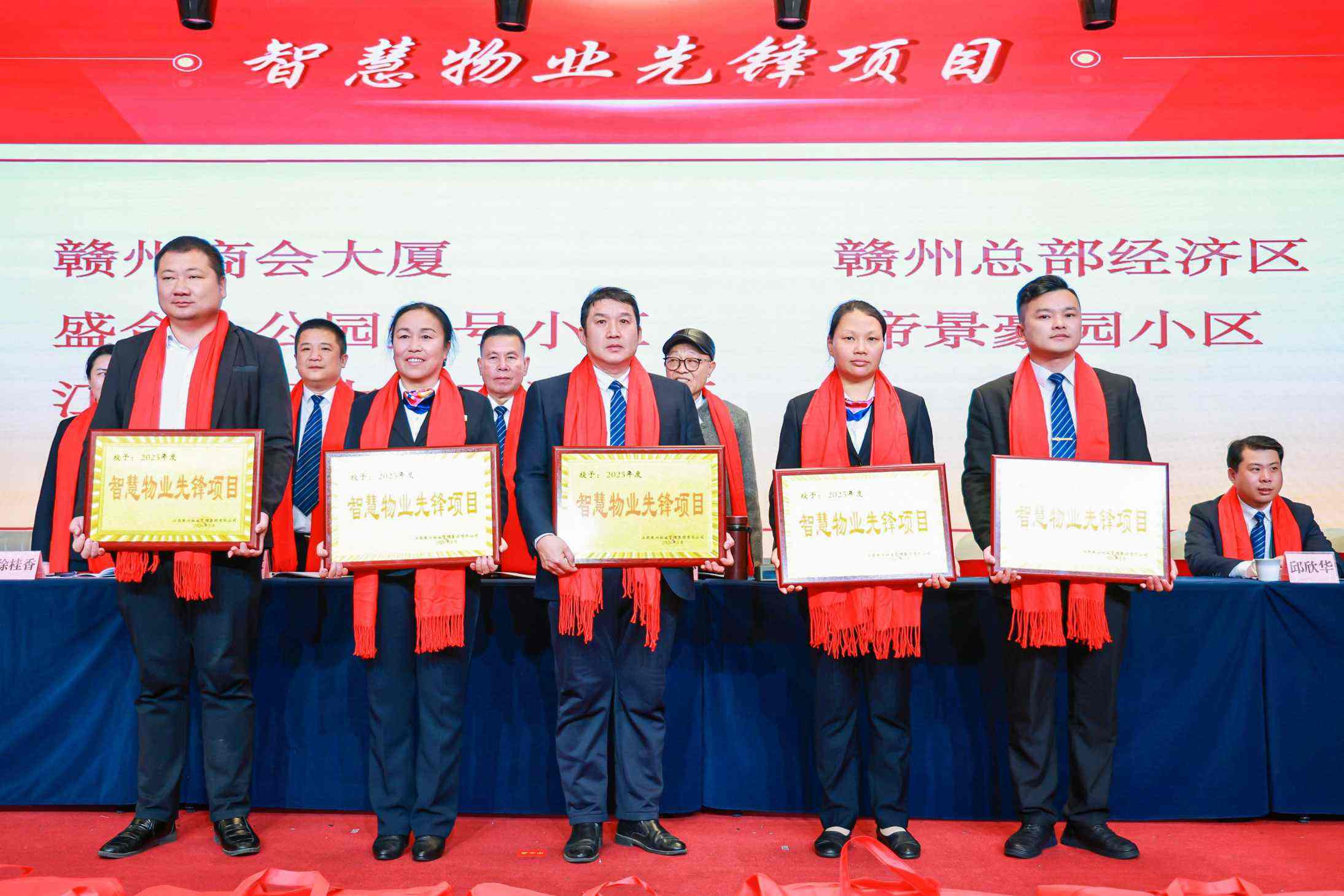 表彰環節高潮迭起,集團常務副總經理徐桂香宣讀《關于表彰2025年度先進集體和優秀個人的決定》。現場先后頒發業務標桿獎、優秀分公司獎、優秀示范項目獎、紅色物業小區獎、智慧物業先鋒項目獎等集體獎項,以及勞動模范獎、市場業績突出獎、優秀管理干部獎、優秀員工獎等個人獎項。南昌分公司、九江市分公司等先進集體,肖忠良、徐理文等勞動模范,閔紅明等市場業績突出個人,以及盧文靜等優秀管理干部、邱迎露等優秀員工依次登臺領獎,領導嘉賓為獲獎者頒發榮譽證書、獎杯與獎品,現場掌聲雷動,致敬每一位實干擔當的燕興奮斗者。