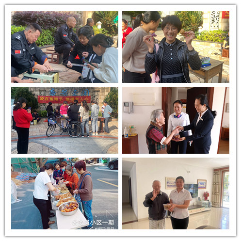10月23日上午,公務員小區(qū)、帝景豪園小區(qū)開展“愛在重陽節(jié)  情暖老人心”重陽節(jié)活動,活動中邀請業(yè)主們品嘗美食芋包子、勺子米果、蔥條等,還開展了免費的磨刀、理發(fā)等便民服務活動。針對行動不便的老人,物業(yè)中心的工作人員上門給他們送愛心米果,讓老人感受到物業(yè)節(jié)日的關懷和溫暖。