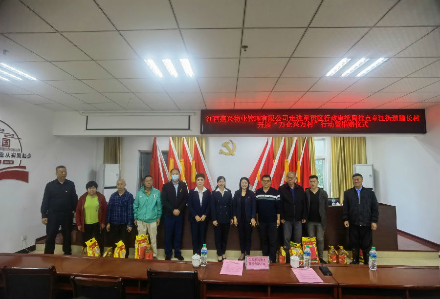 11月10日上午,燕興物業走進章貢區行政審批局掛點章江街道臘長村開展“萬企興萬村”捐贈活動。章江街道黨工委副書記、政法委員顏龍華,章貢區行政審批局政務服務中心主任郭懷仁,臘長村村書記曾廣琦,公司黨委書記、董事長劉燕,常務副總經理、婦聯主席徐桂香出席活動。